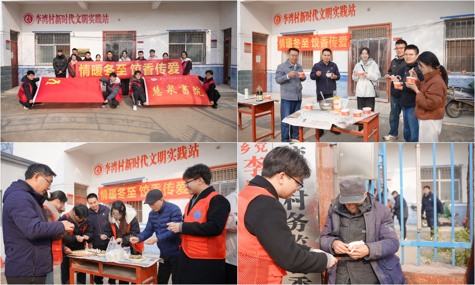 为持续深化校地党建联建工作,弘扬中华优秀传统文化,冬至前夕,慧泉书院学生党支部赴罗山县尤店乡李湾村开展“情暖冬至,饺香传爱”冬至暖心活动,为留守老人和老党员送冬日温暖。慧泉书院师生党员、入党积极分子,李湾村党支部党员代表,校驻李湾村工作队成员等人员齐聚一堂,共迎冬至佳节,共叙校地深情。