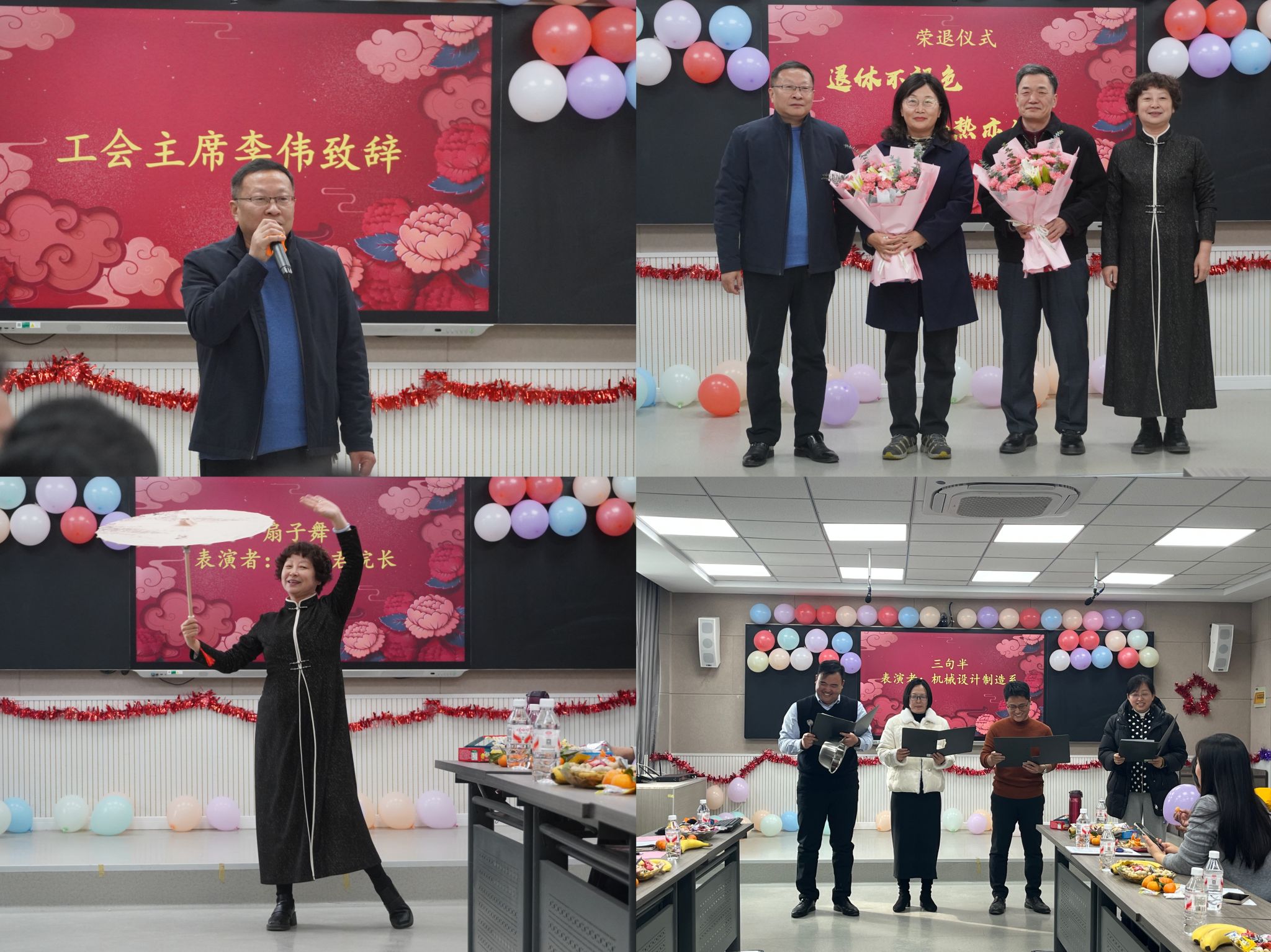 才艺展示环节精彩纷呈,展现了机械学院教职工的多才多艺与蓬勃朝气。学生工作办公室的节目《我爱上班》以幽默形式表达对教育工作的热爱;机械设计制造系的三句半表演诙谐生动,引发阵阵欢笑;机械基础系的朗诵《读中国》深情激昂,抒发家国情怀;智能制造系合唱《当》旋律激昂,点燃全场热情;王丽君的伞舞优雅灵动,王世峰老师的独唱深情动人,赢得满堂喝彩。欢声笑语中,大家感受到机械学院大家庭的温暖与团结的力量。