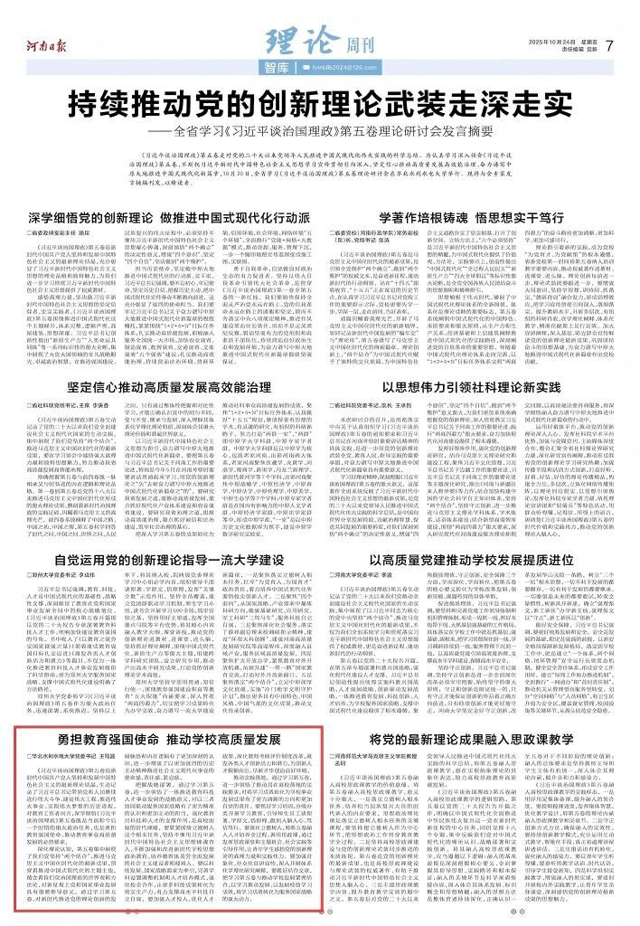 《习近平谈治国理政》第五卷系统总结了党的二十大以来党团结带领全国各族人民推进中国式现代化的伟大实践。为认真学习深入领会《习近平谈治国理政》第五卷,持续推动习近平新时代中国特色社会主义思想学习宣传贯彻走深走实,进一步增强推动高质量发展、实现高效能治理的信心与决心,10月20日,全省学习《习近平谈治国理政》第五卷理论研讨会在我校召开。校党委书记王笃波出席会议,并作《勇担教育强国使命 推动学校高质量发展》的主题发言。10月24日,《河南日报》第7版理论周刊刊发王笃波发言摘要。