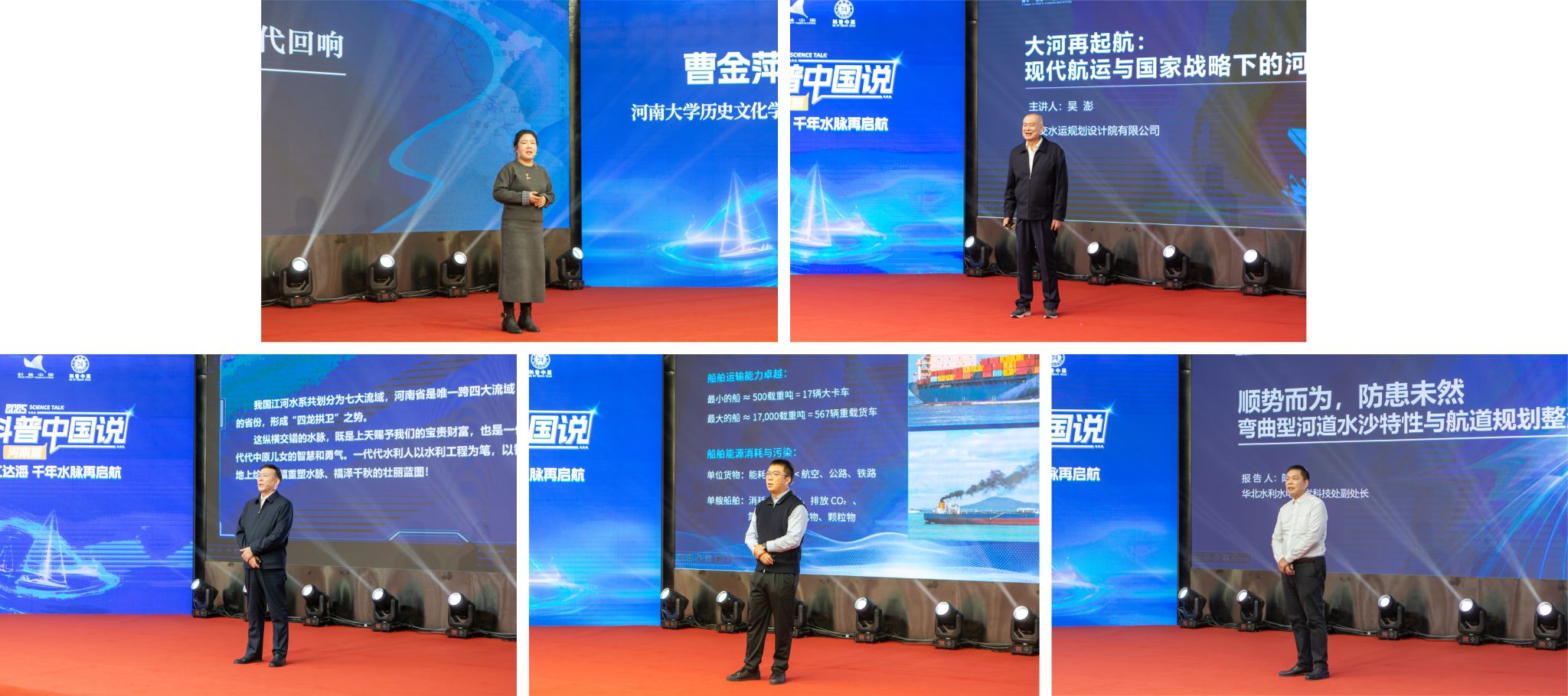 活动现场,五位专家围绕内河航运、水利工程、绿色技术等领域展开深入科普。中国交建副总工程师吴澎系统阐述现代航运“标准化、智能化、绿色化”特征,结合周口港中心作业区一期工程实践,生动展现现代航运在国家综合交通系统中的重要作用。河南大学历史文化学院曹金萍教授以《千年漕运的现代回响》为题,追溯隋唐大运河漕运辉煌历史,解析当代河南依托水脉重构内陆开放优势的战略路径;河南省水利勘测设计研究有限公司副总经理陆海聚焦河南水网建设,阐释南水北调、小浪底等标志性工程如何借助数字孪生技术实现防洪减灾与水资源优化配置;河南港航集团有限公司信息公司及产业研究中心筹备组组长李骁驰介绍了河南在智慧新能源船舶领域的创新突破,如甲醇动力船舶、5G智能航运系统,推动“双碳”目标下绿色水运转型;华北水利水电大学科技处副处长陈建通过解析弯曲河道水沙特性研究,揭示航道整治中“顺势而为”的工程智慧,为淮河、沙颍河航道升级提供科学支撑。