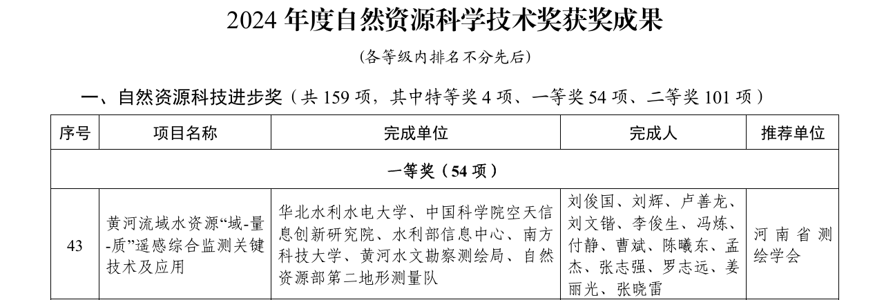 近日,自然资源部正式发布了“自然资源部关于2024年度自然资源科学技术奖获奖成果的公告”,公布了2024年度自然资源科学技术奖获奖名单,我校刘俊国教授领衔完成的“黄河流域水资源‘域-量-质’遥感综合监测关键技术及应用”项目荣获自然资源科学技术进步奖一等奖,实现了我校荣获自然资源部科技进步奖一等奖的历史性突破。