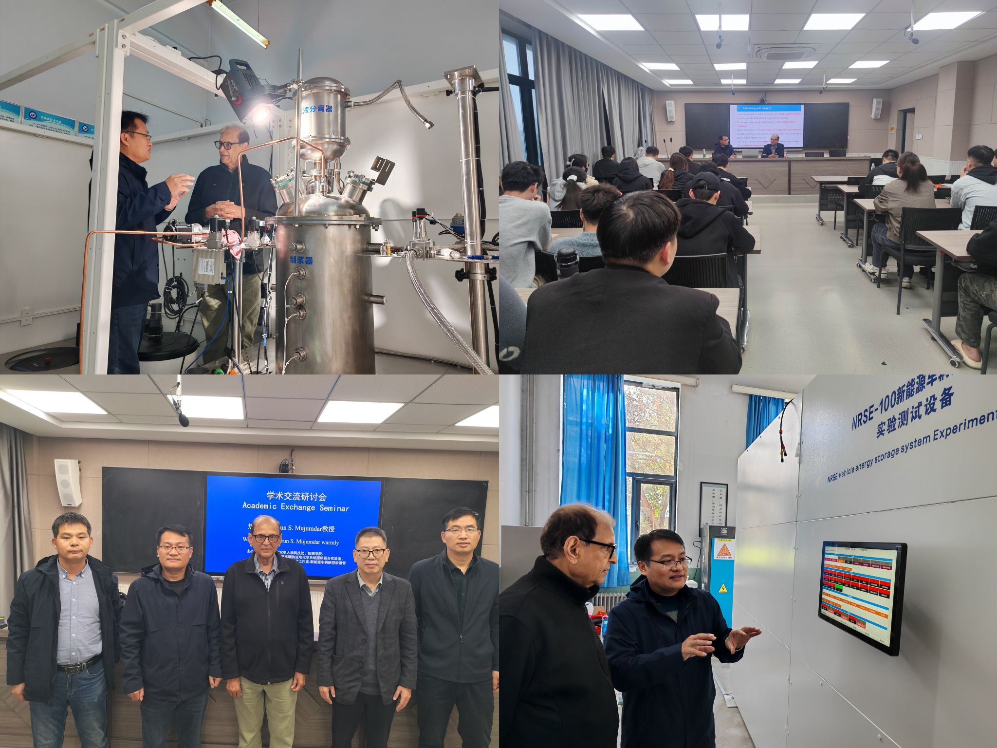 19-20日,Mujumdar先后前往学校多个实验室,实地考察了河南省新能源车辆热流电化学系统国际联合实验室等多个科研平台的实验仪器与设备情况。他对我校科研平台建设成果给予了高度肯定,并就实验平台建设优化、技术研发应用等关键环节进行现场指导。同时围绕科研平台与人才培养的协同机制、社会服务功能的拓展路径等提出了宝贵意见。