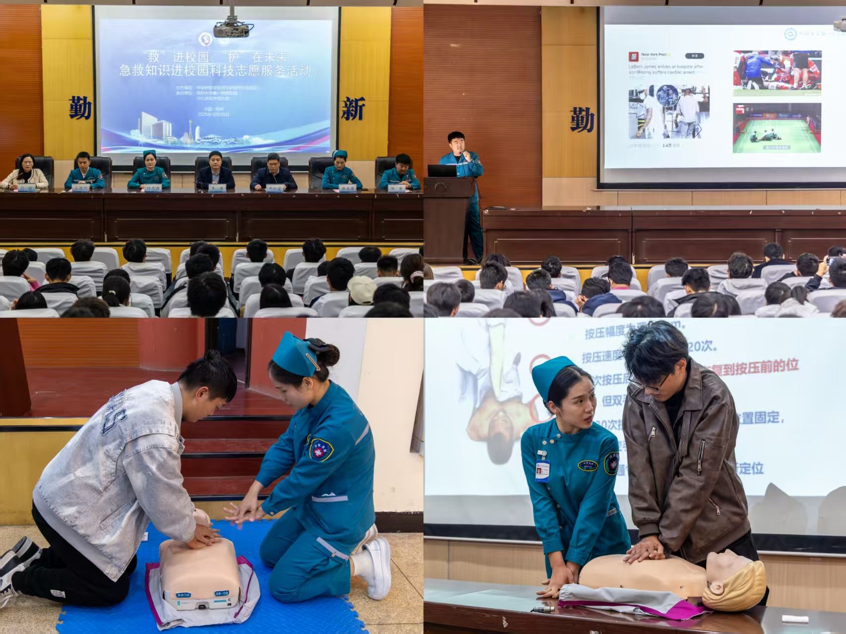 活动中,郑州大学第一附属医院陶晋医师从正确拨打120急救电话,到如何处理心搏骤停、气道异物梗阻、运动损伤等校园常见急症,用通俗的语言配合动画与实际操作,系统讲解了心肺复苏、AED使用及海姆立克急救法的核心要点。医护志愿者通过真人演示,向师生们展示胸外按压、人工通气、AED贴片与除颤全流程,并邀请同学上台进行实际操作与指导。师生们积极参与互动,与医护人员相互交流,体验救护过程,不断增进理论知识和提高实践能力。