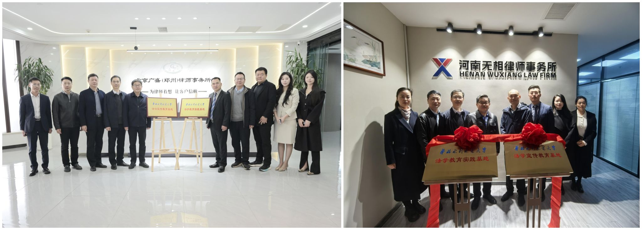 近日,法学院党委书记潘松岭,院长刘华涛一行先后走访了北京广盛(郑州)律师事务所与河南无相律师事务所,并分别举行法学教育实践基地与法治宣传教育基地共建签约暨揭牌仪式,以访企拓岗为抓手,搭建法学教育实践与就业服务平台,开启了院所协同育人的新篇章。