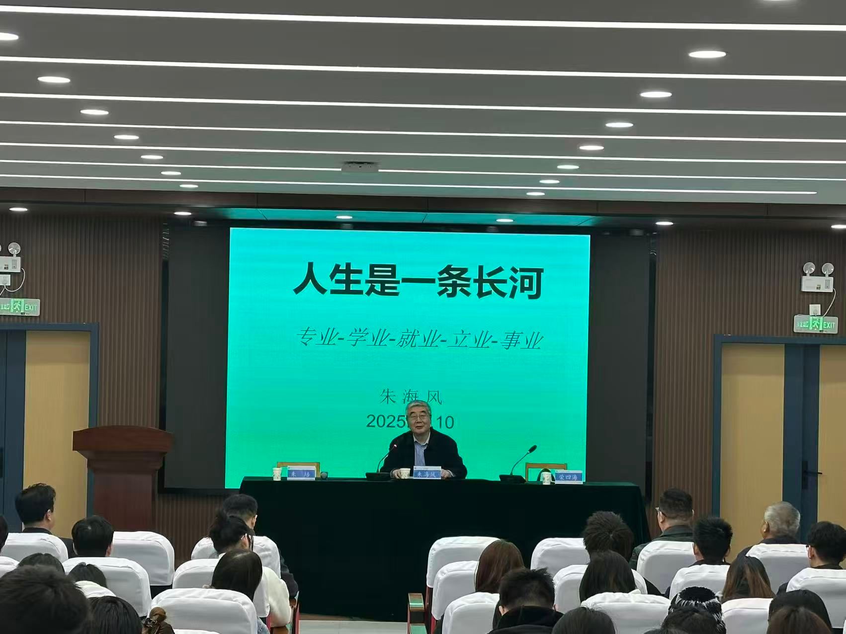 荣四海代表学校关工委为朱海风教授颁发证书,正式聘请其为学校“五老”报告团首席讲师。接着,朱海风从“人生是一条长河”的哲学思考入手,结合中华水文化的深厚底蕴,阐释了人生应有的宽度与厚度。他以长河之水喻人,阐述了人生长河“不能无本源”“不能无堤防”“不能无德性”“不能无气势”的道理,引导同学们思考生命的价值与方向。