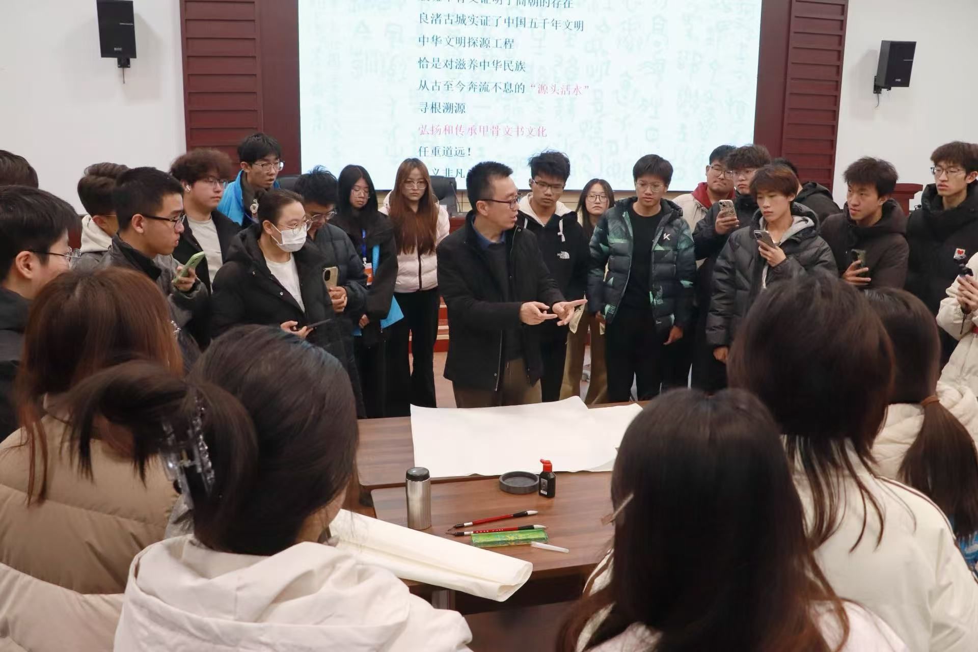 近日,由校团委主办的《黄河文明的记忆代码——甲骨文书文化》书法大讲堂在我校第七会议室举办。本次活动邀请中国书法家协会会员、人文与艺术学院金玉甫教授,带领师生穿越千年历史长河,深入探寻甲骨文所承载的文化根脉与书法魅力。