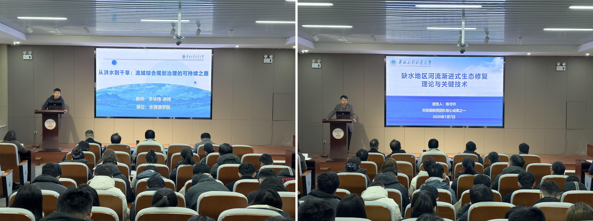 论坛分为两个阶段,第一阶段为专家讲座。三位学者围绕流域生态环境治理的前沿议题展开分享。陈守开教授以《缺水型河流生态修复理论、技术及应用》为题,系统阐述了渐进式生态修复理论的最新进展;李华伟博士聚焦《从洪水到干旱:流域综合规划治理的可持续之路》,深入分析气候变化背景下的水文过程与水资源演变规律;肖连刚副教授以《全球干旱半干旱地区风蚀防控效应研究》为题,分享了风蚀防控的前沿成果。张少伟总结指出,三位专家的分享为人居科学与设计学院举行研究生论坛在生态修复、水资源管理等交叉领域的科研方向提供了重要启示。