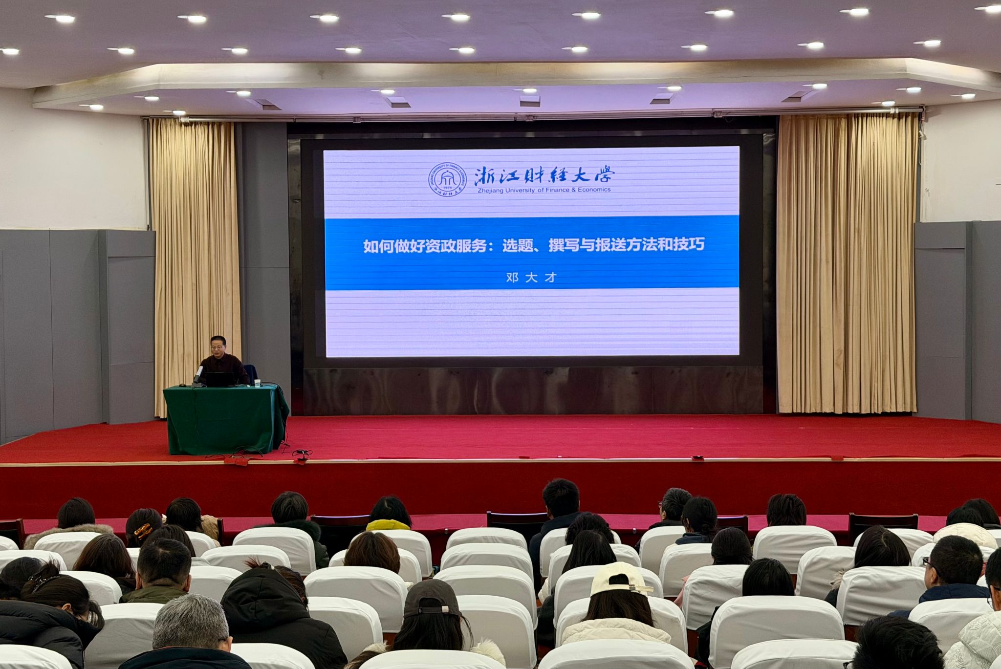 为进一步提升学校智库资政服务能力,凝心聚力推进智库培育建设,2026年1月8日上午,由社会科学部和科技处联合组织的“如何做好资政服务:选题、撰写与报送的方法与技巧”学术讲座在龙子湖校区第一报告厅成功举办。讲座特邀浙江财经大学公共管理学院邓大才教授主讲,全校各学院、科研院所科研主管院长、科研团队带头人、科研骨干等约250人参会。讲座由社会科学部副部长杨国斌主持。