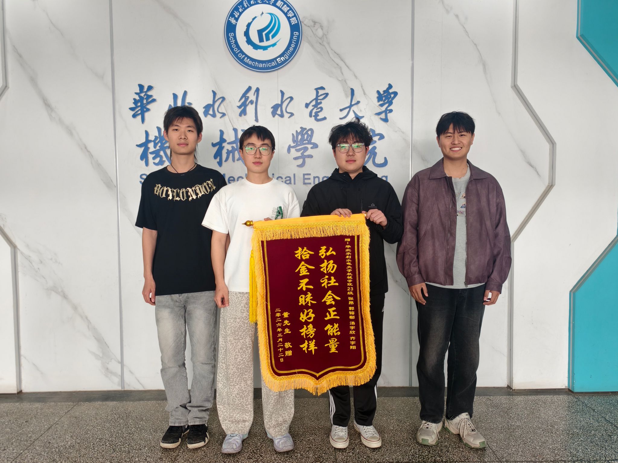 当日晚间,2023级机械设计制造及其自动化(中外合作办学)专业张昂、郭镕郗、汤宇欣、齐宇翔四名同学返校途中捡到一部手机。考虑到失主焦急,四人在寒风中原地等候四十余分钟,终将手机完璧归赵,并婉拒失主物质感谢。3月25日,失主专程送来锦旗,向四位同学表达谢意。据悉,四人中两人为学生党员,一人任班长、一人任辅导员助理,用行动践行了诚信美德。