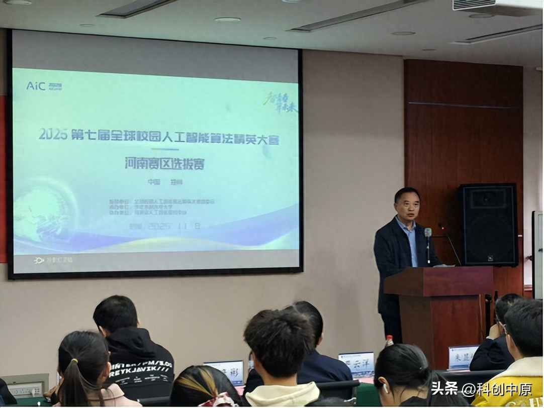 2025年11月8号上午,第七届全球校园人工智能算法精英大赛河南赛区选拔赛开幕式在华北水利水电大学龙子湖校区大学科技园207举行,共吸引30余所院校、600余支队伍参赛。华北水利水电大学副校长李彦彬,淮阴工学院副校长严云洋,河南大学教务处副处长朱显峰,河南大学创新创业实训中心主任王立,河南职业技术学院现代信息技术学院副教授张习民,华北水利水电大学工程实践与创新中心副主任段俊法等领导和嘉宾出席。华北水利水电大学工程实践与创新中心副主任范钦栋主持开幕式,本次大赛以“算法编织梦想,智能闪耀未来”为主题,搭建起人工智能领域青年学子交流竞技、施展才华的高端平台,助力河南人工智能人才培养与产业创新发展。