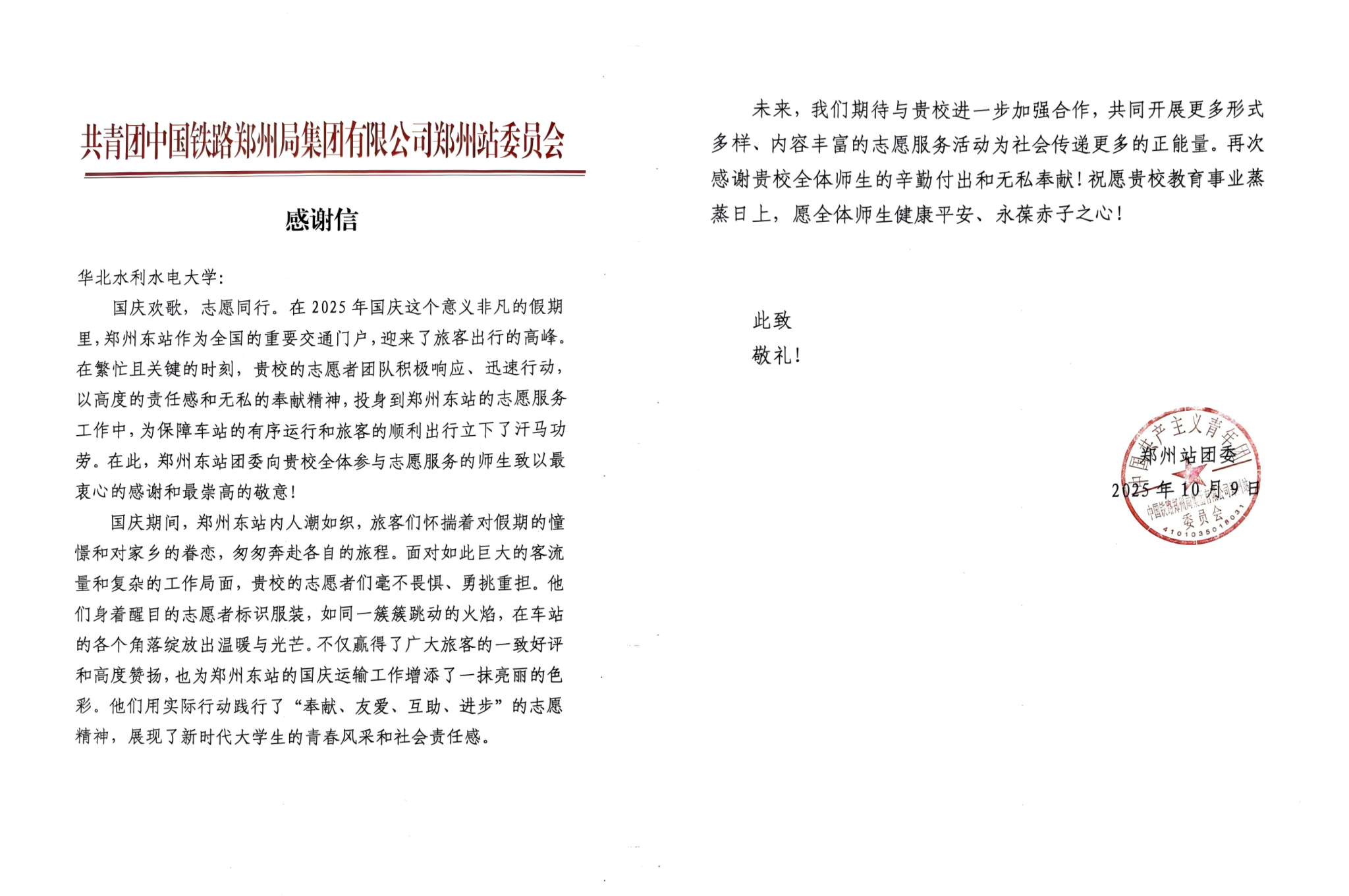 近日,郑州站团委向我校发来感谢信,对我校青年学子国庆假期期间在郑州东站参与的“红韵高铁,志愿领航”专项志愿服务活动表示高度赞扬。信中特别指出,在国庆客流高峰时段,我校志愿者凭借专业化、体系化的服务,日均服务旅客超过3000人次,解决各类实际问题200余件,成为车站内一道亮丽的风景线,有力彰显了新时代青年“奉献、友爱、互助、进步”的志愿精神与责任担当。
