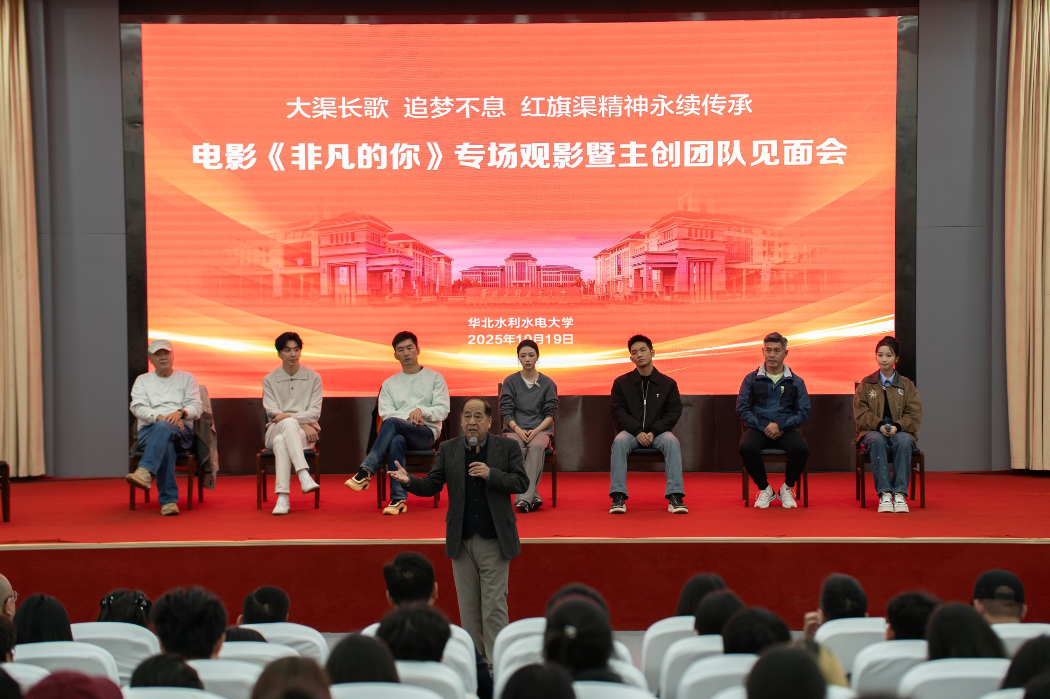 观影结束后,活动进入互动交流环节。尹晋华在现场深情地描述了影片的创作起源,他指出,习近平总书记在陕西延安和安阳考察时强调要“发扬延安精神和红旗渠精神”,两种精神“是一脉相承,是中华民族不可磨灭的历史记忆,永远震撼人心”,电影《非凡的你》以新时代的视角回望红旗渠建设,从另一个角度谱写了红旗渠建设过程中的科学创新精神和甘于奉献精神,他勉励当代大学生要弘扬英模精神、厚植家国情怀、勇担时代重任,为国家水利建设奉献自己的力量。