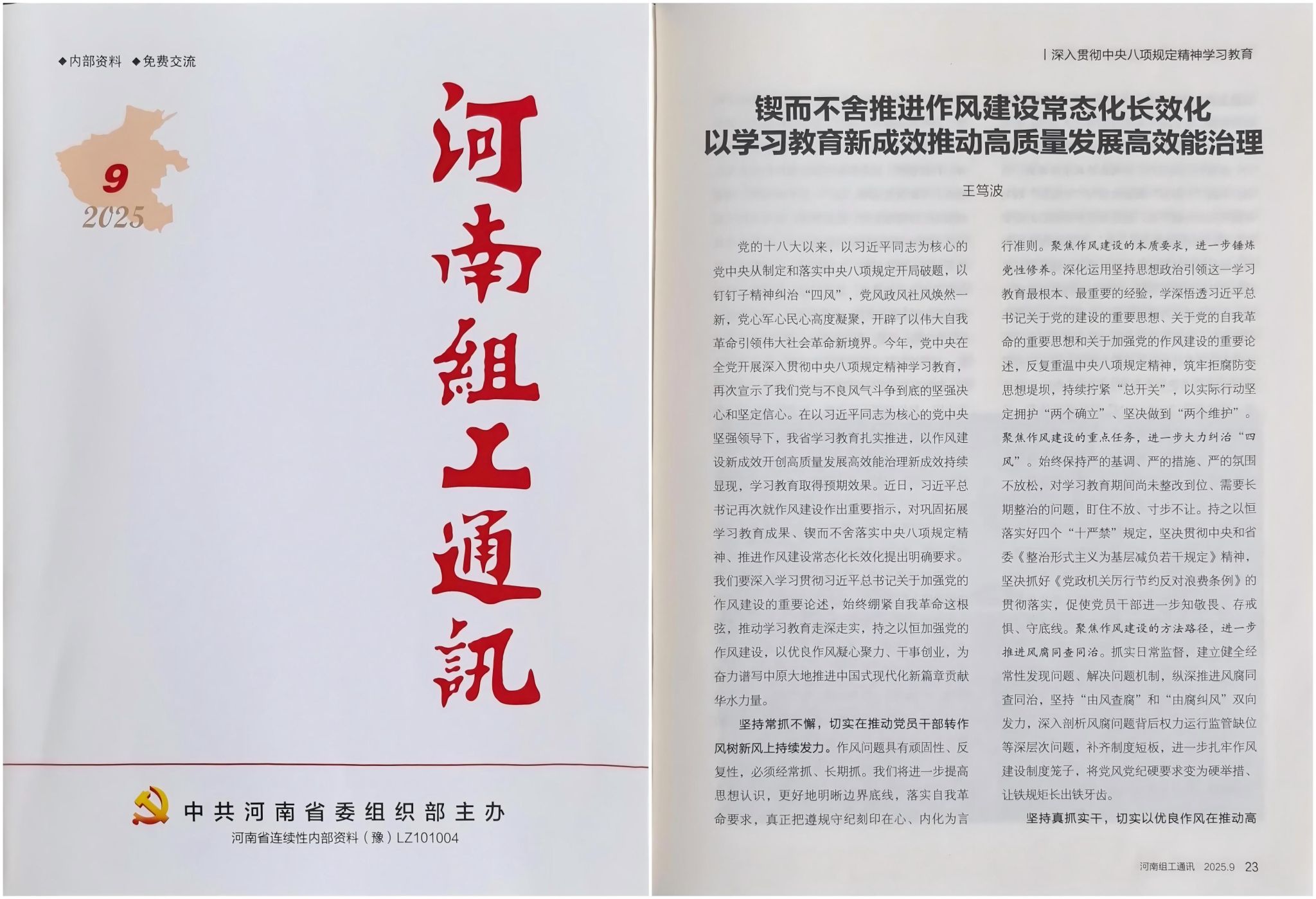 编者按:在全党持续深化落实中央八项规定精神、推进作风建设常态化长效化之际,应《河南组工通讯》编辑部约稿,学校党委书记王笃波同志撰写的《锲而不舍推进作风建设常态化长效化 以学习教育新成效推动高质量发展高效能治理》一文,已于该刊2025年第9期正式刊发。文章立足新时代党的作风建设要求,紧扣以伟大自我革命引领伟大社会革命的实践逻辑,深刻阐述了将学习教育成果转化为推动高质量发展、提升治理效能的现实路径与长效机制。文章见解深刻、逻辑严密、富有哲理,既彰显了坚定的政治自觉与使命担当,又对推动学习教育扎实开展有较强的启发和借鉴意义。现转发如下,供学习参考。