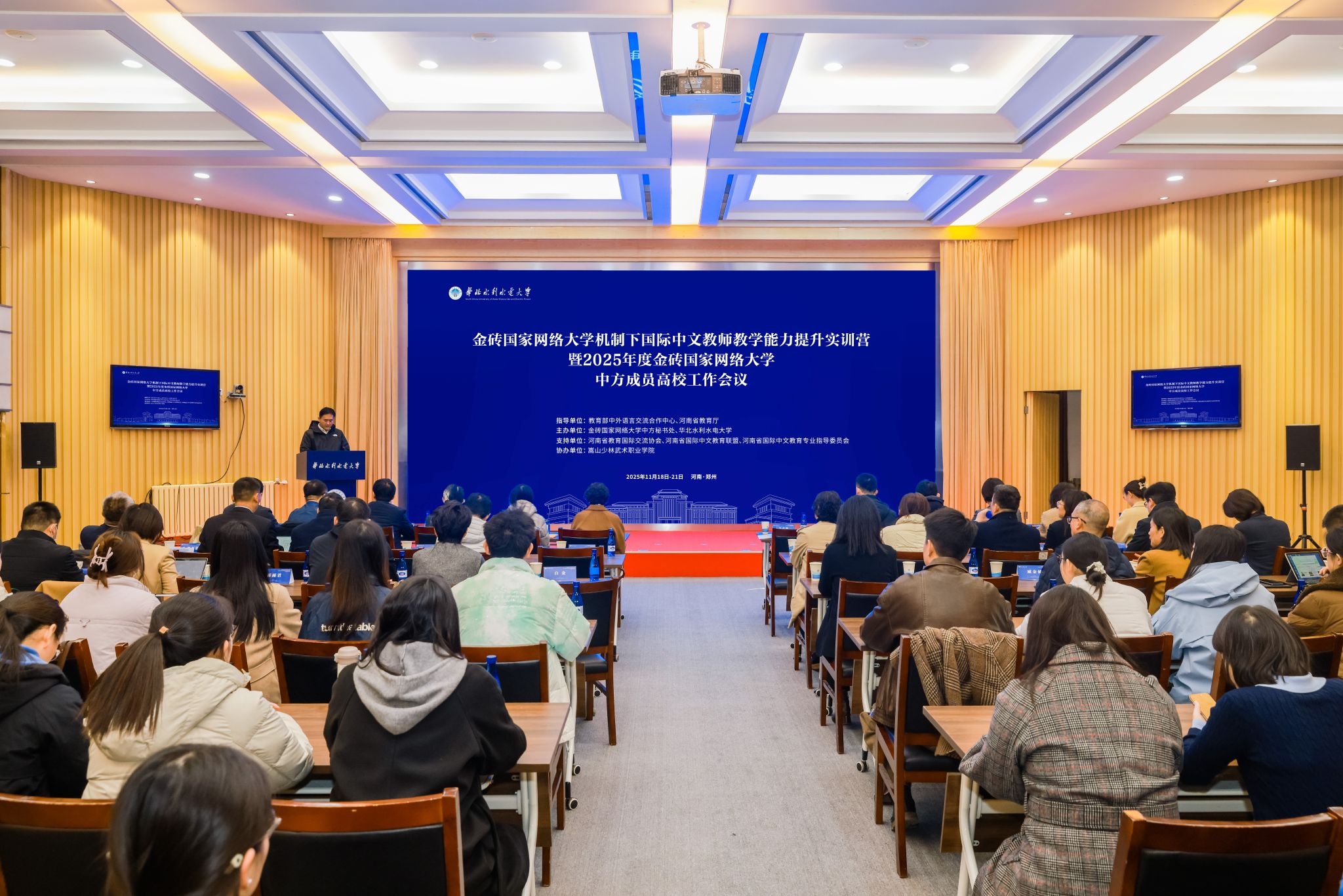 11月18日至21日,我校举办金砖国家网络大学机制下国际中文教师教学能力提升实训营暨2025年度金砖国家网络大学中方成员高校工作会议。会议以“协同创新·机制共建·能力提升”为主题,汇聚了来自全国13所金砖国家网络大学中方成员高校的代表及教育领域专家,通过专题报告、实地参访、座谈交流等形式,共商国际中文教育发展与高校多边合作大计。副校长李彦彬、河南省教育厅对外合作与交流处处长王华星出席会议并致辞,国际交流与合作处处长魏新强主持会议。
