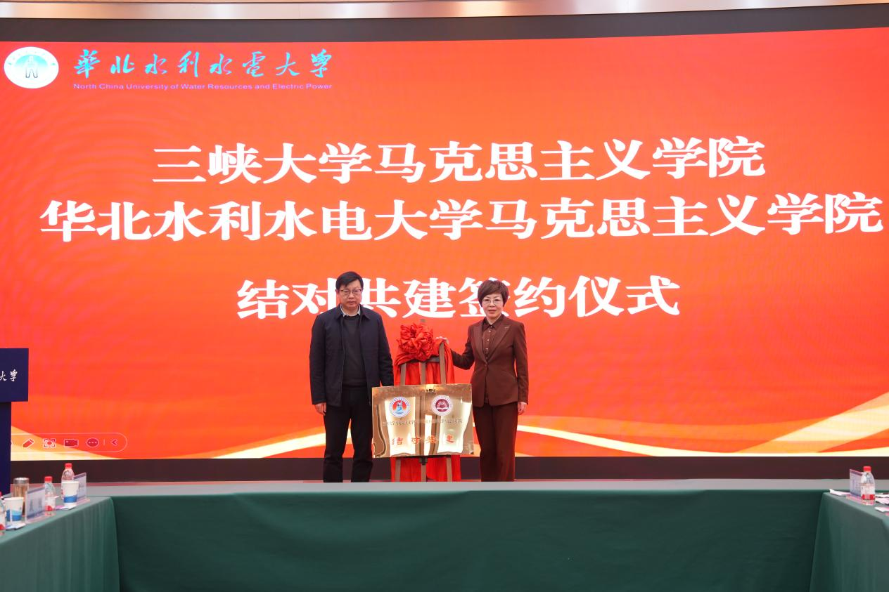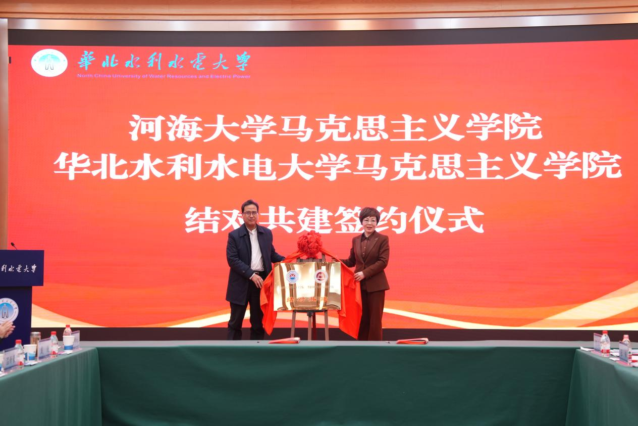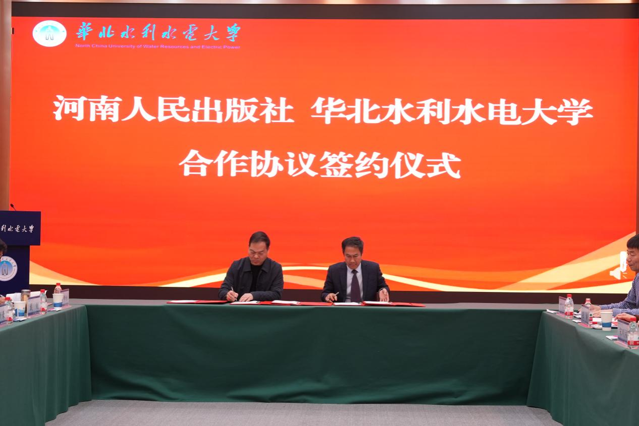 在签约揭牌仪式阶段,校党委副书记焦爱萍与中共河南省委宣传部理论处一级调研员胡茂连为“华北水利水电大学数智化大思政教研中心”揭牌;河南人民出版社总编辑温新豪与我校副校长宋刚福代表双方签订合作协议;马克思主义学院负责同志分别与河海大学、三峡大学马克思主义学院负责同志签订结对共建协议,搭建校际协同发展平台。