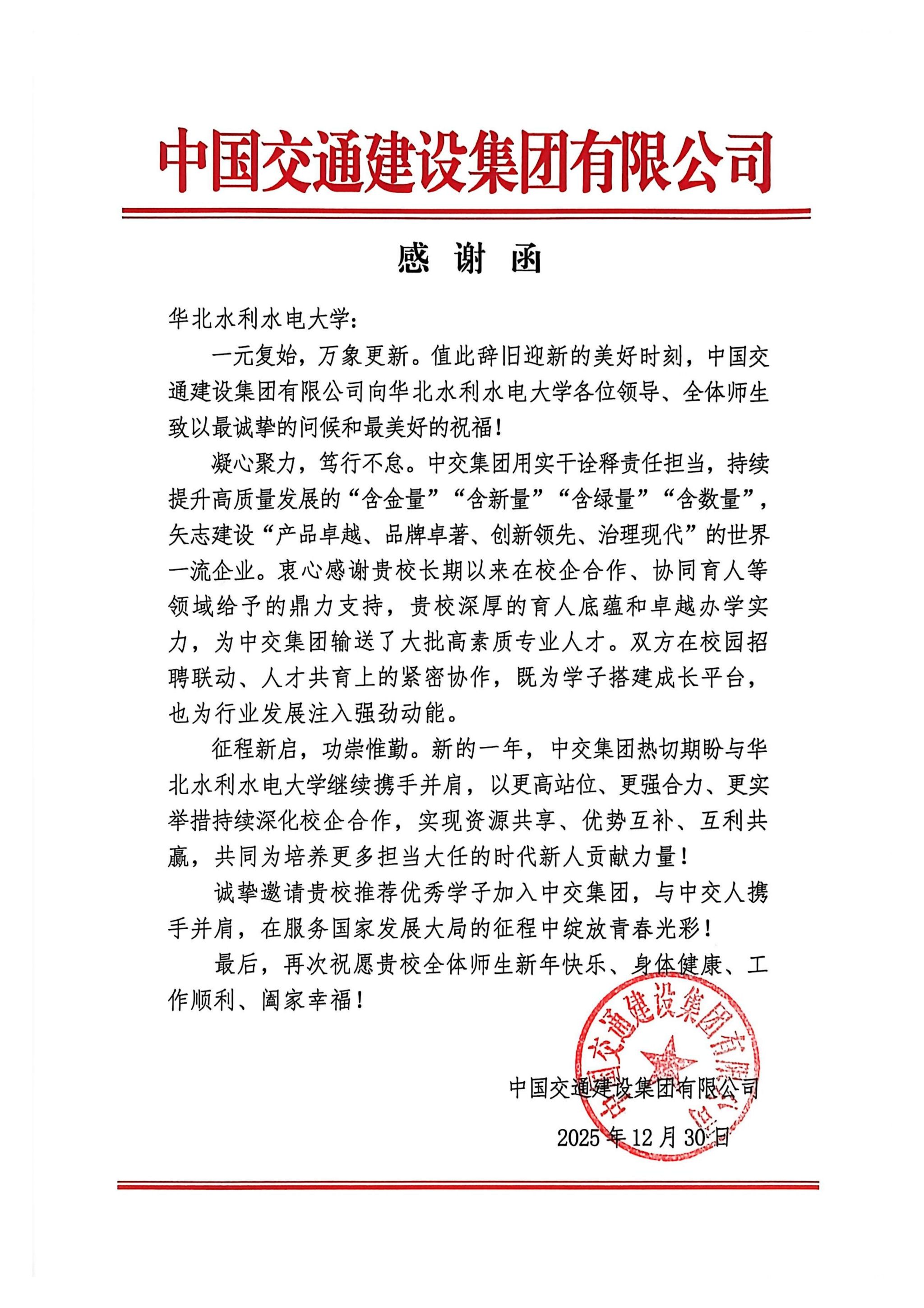 值此2026年新年来临之际,我校收到中国交通建设集团有限公司(以下简称“中交集团”)发来的感谢函。函中充分肯定了我校在校企合作、协同育人等方面作出的贡献,并对我校的办学实力与人才培养质量给予高度评价。
