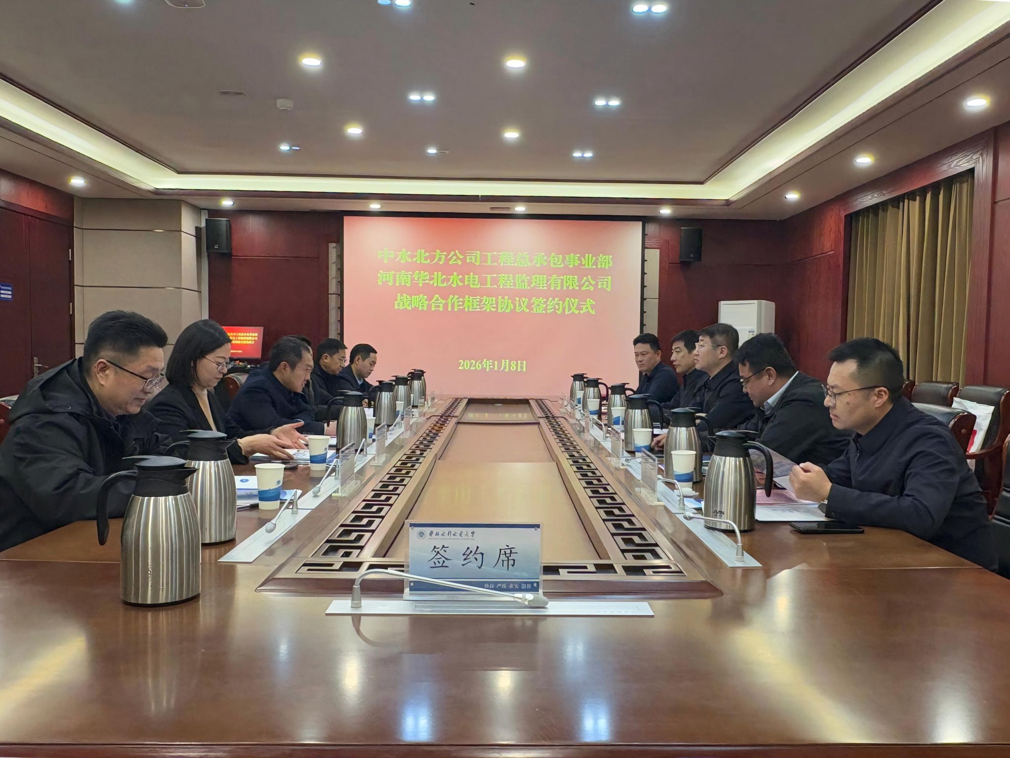 座谈会上,中水北方公司总包事业部副总经理(监理业务负责人)温贵明和河南华北水电工程监理有限公司董事长兼总经理刘英杰分别介绍单位情况,并签订战略合作框架协议。