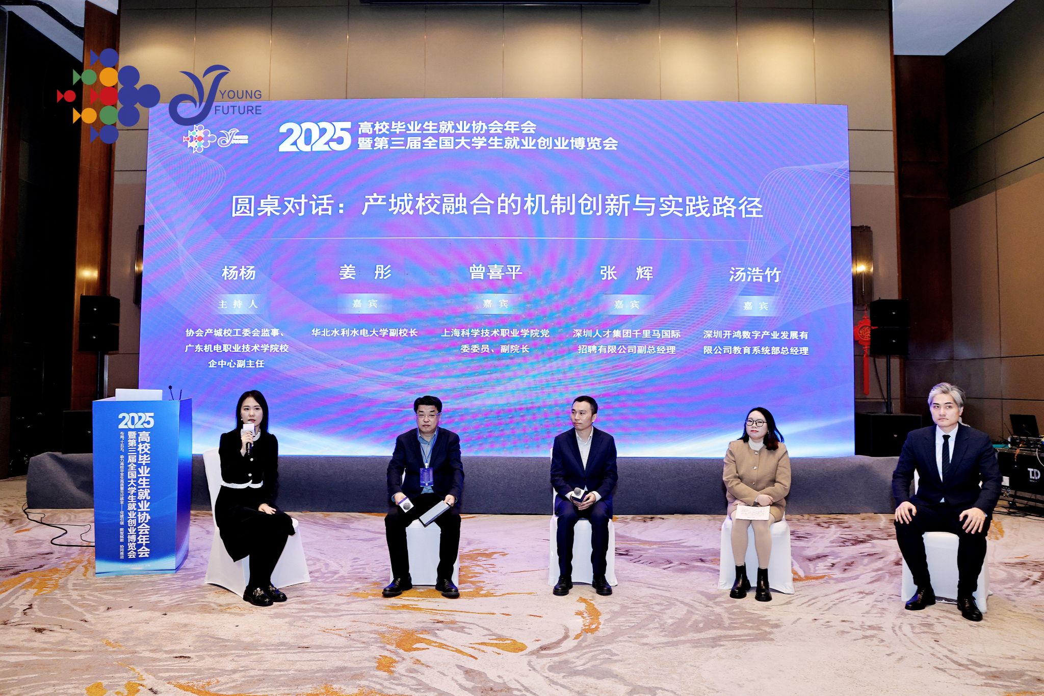 圆桌对话环节,姜彤以“三峡班”订单式培养项目为案例,阐释“顶天立地”的产教融合路径:精准对接国家战略,融入前沿技术;深度服务区域发展,近三年输送12000余名人才,中西部就业比例达68%;创新“三共”机制与“双导师制”,毕业生岗位适应期缩短至3-6个月,就业率与专业对口率连续三年100%;构建长效合作机制,该模式入选全国产教融合典型案例。