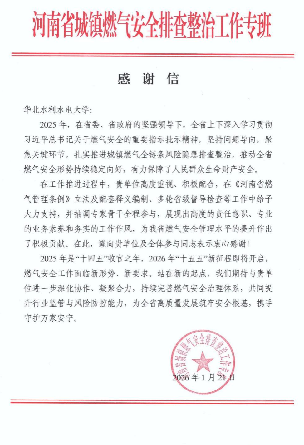 近日,我校收到来自河南省城镇燃气安全排查整治工作专班的感谢信,对我校在《河南省燃气管理条例》立法及配套释义编制、多轮省级督导检查等工作中做出的贡献及全体人员的辛勤付出表达由衷的感谢。