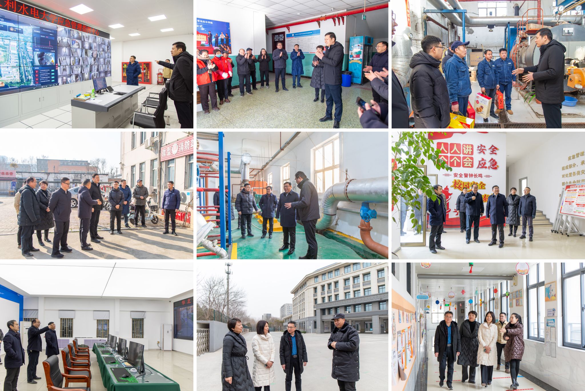 校领导先后到教学楼、学生宿舍楼、应急管理指挥中心、热交换站、保卫处、华水小学等场所,与在岗值守人员亲切交谈,仔细了解假期期间教学楼管理、宿舍服务、安防监控、能源保障等工作情况,并对大家恪尽职守、默默奉献的精神表示高度赞扬,特别感谢他们牺牲与家人团聚的时间,以高度的责任感和敬业精神守护着校园的平安运转。