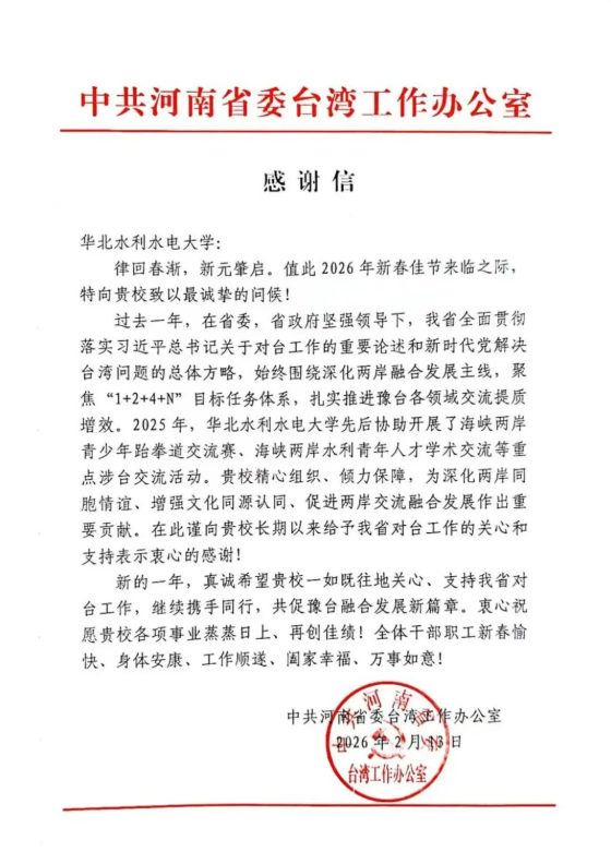 感谢信指出,2025年,在省委、省政府坚强领导下,我省全面贯彻落实习近平总书记关于对台工作的重要论述和新时代党解决台湾问题的总体方略,始终围绕深化两岸融合发展主线,聚焦“1+2+4+N”目标任务体系,扎实推进豫台各领域交流提质增效。我校主动担当、积极作为,充分发挥水利学科特色与人才智力优势,先后协助开展海峡两岸青少年跆拳道交流赛、海峡两岸水利青年人才学术交流等重点涉台交流活动。学校以精心的组织、周密的部署、倾力的保障,为深化两岸同胞情谊、增强文化同源认同、促进两岸交流融合发展筑牢了坚实桥梁,为服务全省对台工作大局贡献了重要力量。