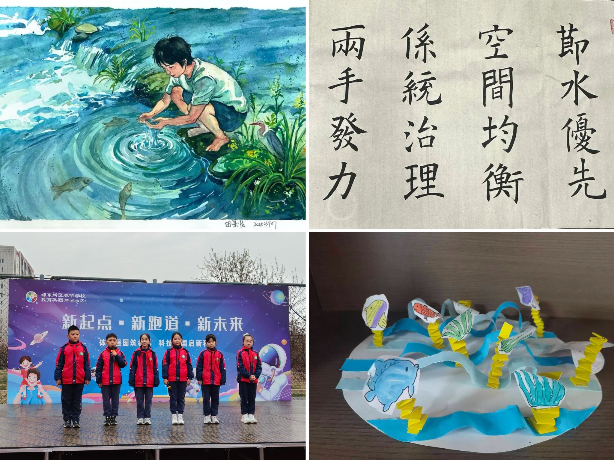 校团委、人文与艺术学院联合开展水文化艺术创意作品征集,涵盖海报、摄影、短视频等多种形式。清源书院举办“清源水韵”文创活动,通过节水三行诗、表情包设计等激发学生创意。华水小学深挖传统水文化,开展“上巳亲水 传承雅韵”体验活动,将临水诵诗、亲水手工与护绿实践结合,并举办升旗仪式暨文艺展演,通过作品展示、倡议宣读、水主题歌曲演绎,让水文化入脑入心。