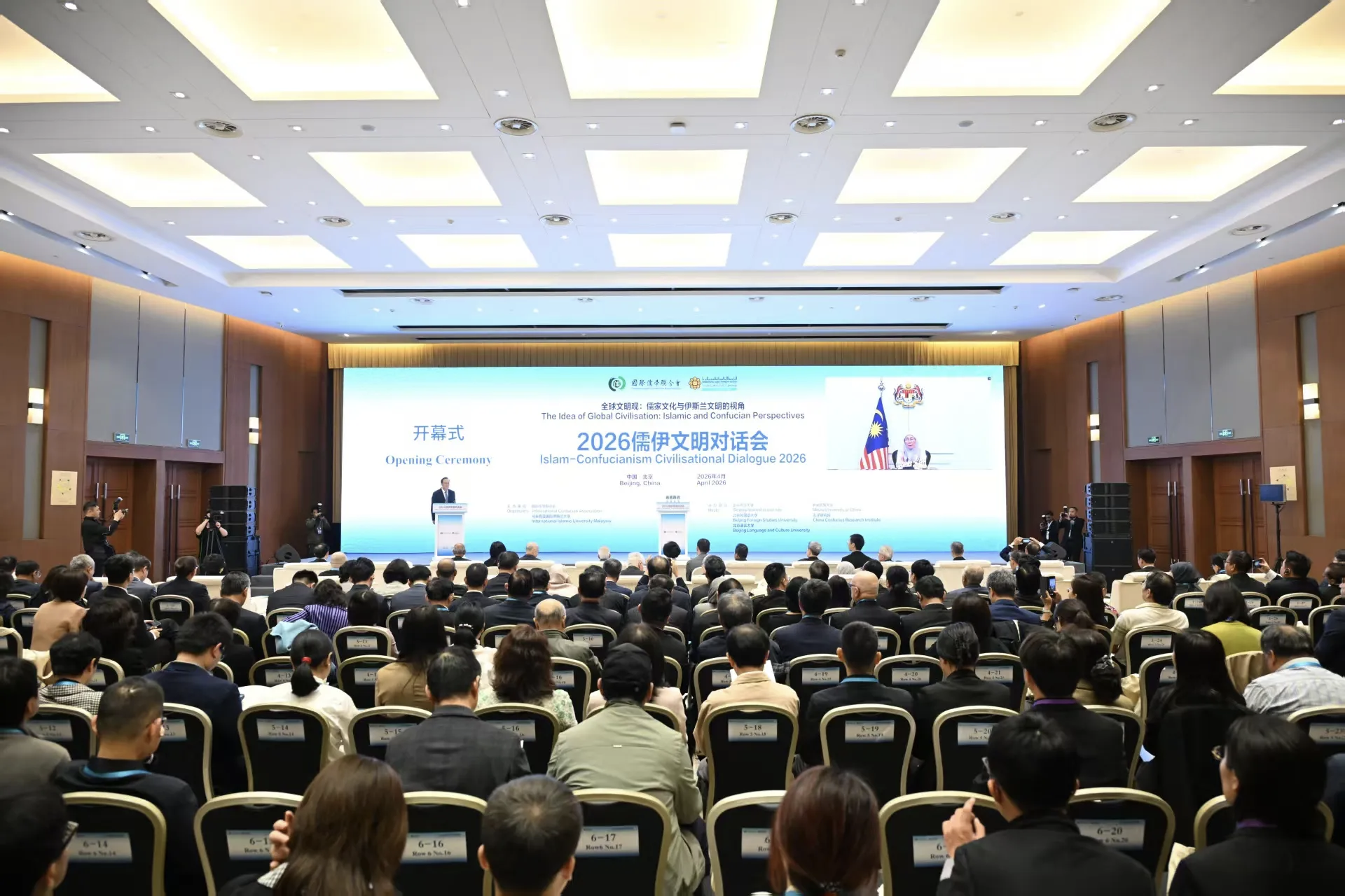 4月16日,在习近平主席对马来西亚进行国事访问一周年之际,由国际儒学联合会和马来西亚国际伊斯兰大学共同主办的2026儒伊文明对话会在北京友谊宾馆举行。对话会以全球文明观:儒家文化与伊斯兰文明的视角为主题,马来西亚总理安瓦尔・易卜拉欣发表视频致辞,马来西亚国会议员、总理夫人、前副总理旺・阿兹莎线上出席并致辞,国际儒学联合会会长孙春兰出席并致辞。来自中国、马来西亚等24个国家的近300位嘉宾、高校校长与知名学者参会。我校校长刘俊国受邀出席会议,并在中马大学校长圆桌会议上,以《加强水利国际化人才,培养服务中马教育科技合作》为题作主旨报告。