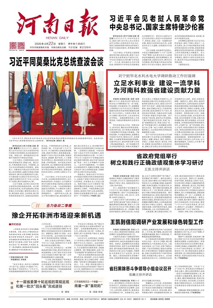 本报讯(全媒体记者 刘婵 张笑闻)4月21日,省委书记刘宁到华北水利水电大学调研推动“双一流”创建、科技创新、学科建设等工作,强调要深入贯彻落实习近平总书记关于教育的重要论述和在河南考察时重要讲话精神,牢记为党育人、为国育才使命,落实立德树人根本任务,立足水利水电办学特色,一体推进教育科技人才改革发展,为建设科教强省作出更多贡献。