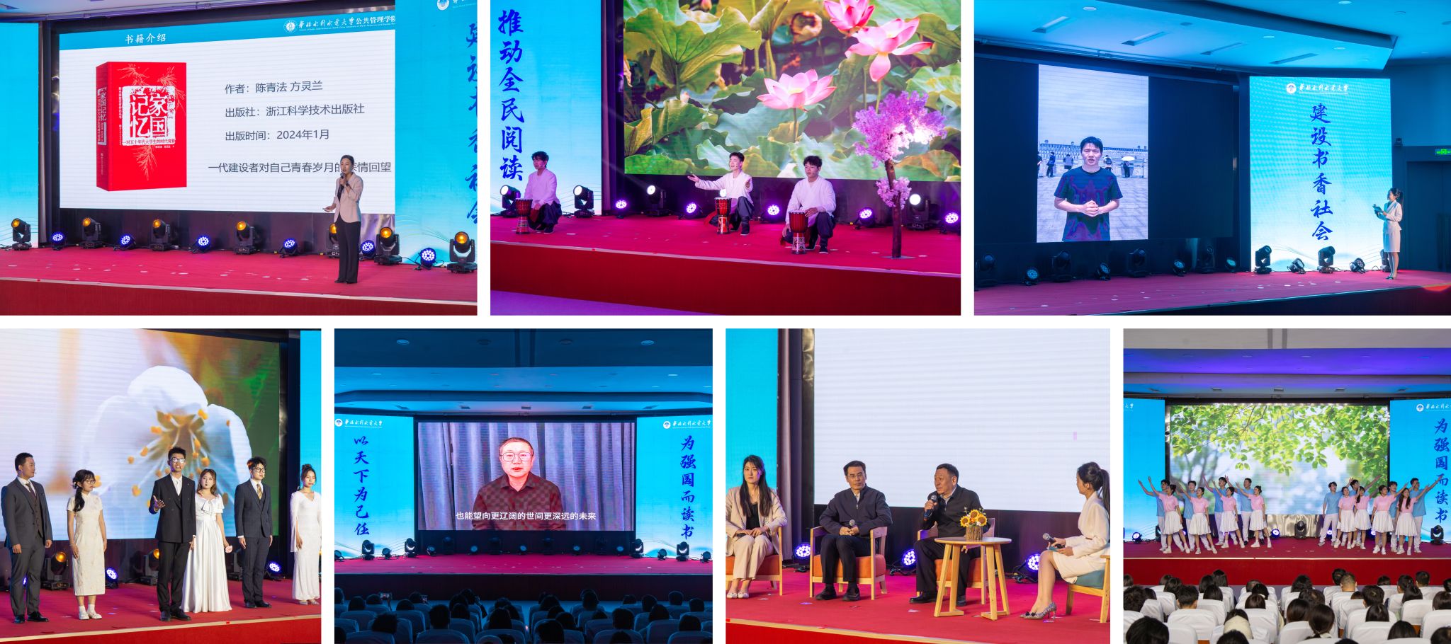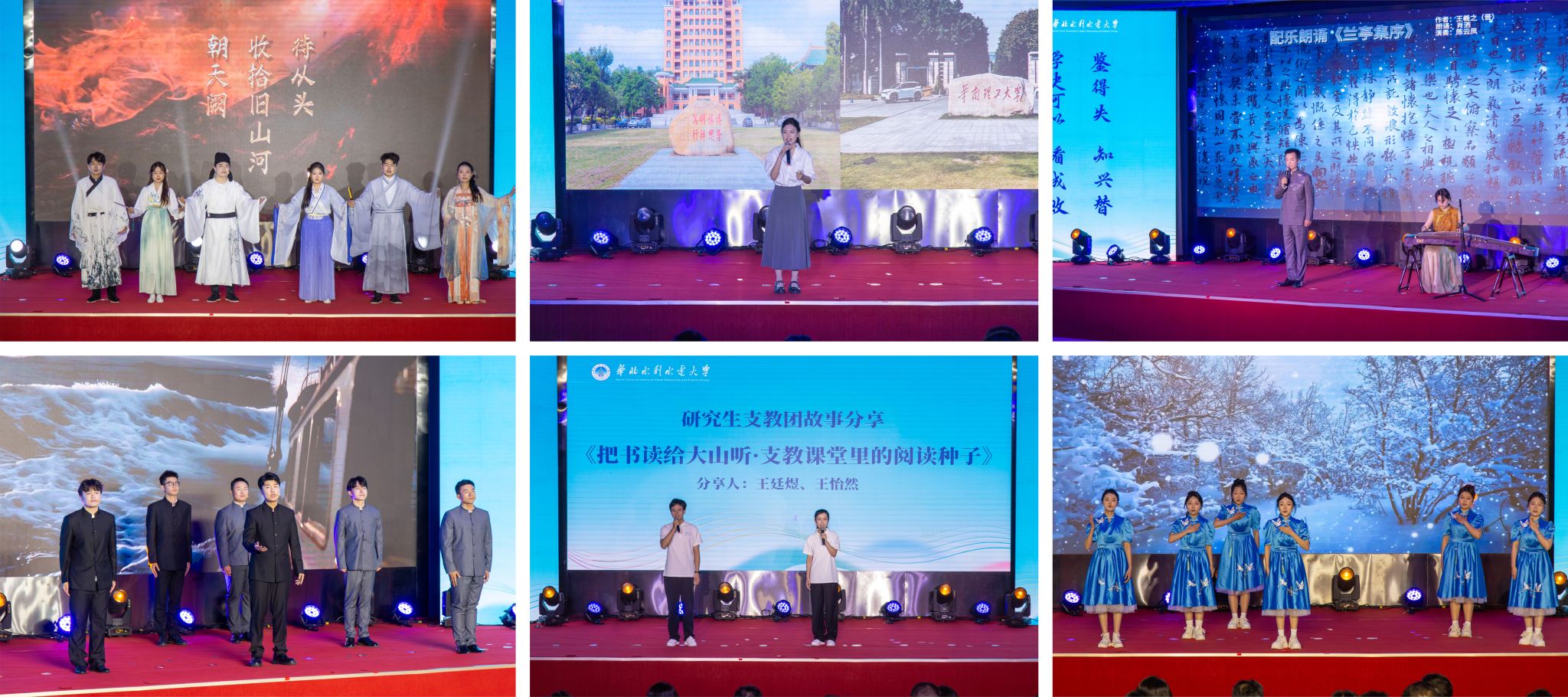 活动在开场视频《为强国而读书》中拉开帷幕。古诗词联诵《回望·历史眼眸》《今朝·意气风发》《来日·风华共绽》串联古今,彰显中华优秀传统文化的深厚底蕴;学生阅读故事分享《在华水读书:一本书如何照亮青春》讲述阅读与成长同行的青春故事;诵读《兰亭集序》在经典吟诵中传递书香之美;研究生支教团带来的《把书读给大山听:支教课堂里的阅读种子》,生动展现了华水青年在基层实践中播撒希望、奉献青春的责任担当;诵读舞蹈《月光下的中国》、教师导读式分享《家国记忆:一对五十年代大学生的时代背影》、诵读《开花》等节目,以多样化形式呈现阅读之美、信仰之光和家国之情;空中连线《在大国重器现场读懂中国》把镜头对准三峡水利枢纽工程,让书本知识与工程实践同频共振;三位不同年代校友带来的《从书斋到岗位:在强国征程中展现华水人的风采》,深情讲述了华水人把个人理想融入国家需要、在报国征程中实干担当的奋斗故事。华水校友、著名科幻作家刘慈欣视频寄语青年学子,既要埋头读书,也要仰望星空;既要读懂中国,也要创造未来。师生合诵《春》,以昂扬蓬勃的精神风貌将整场活动推向高潮。