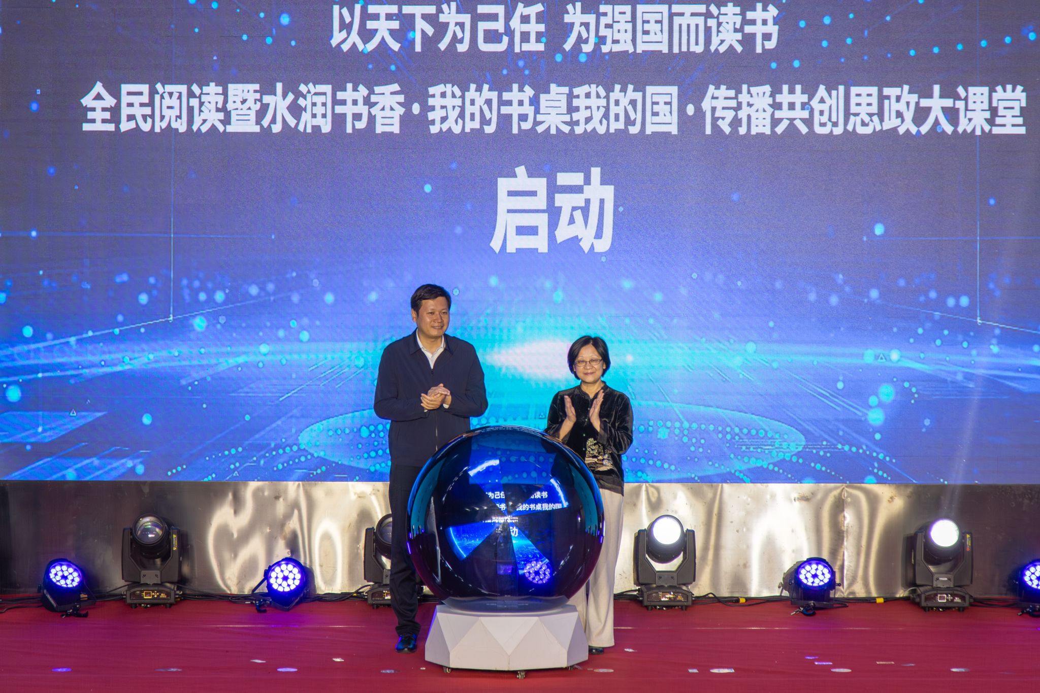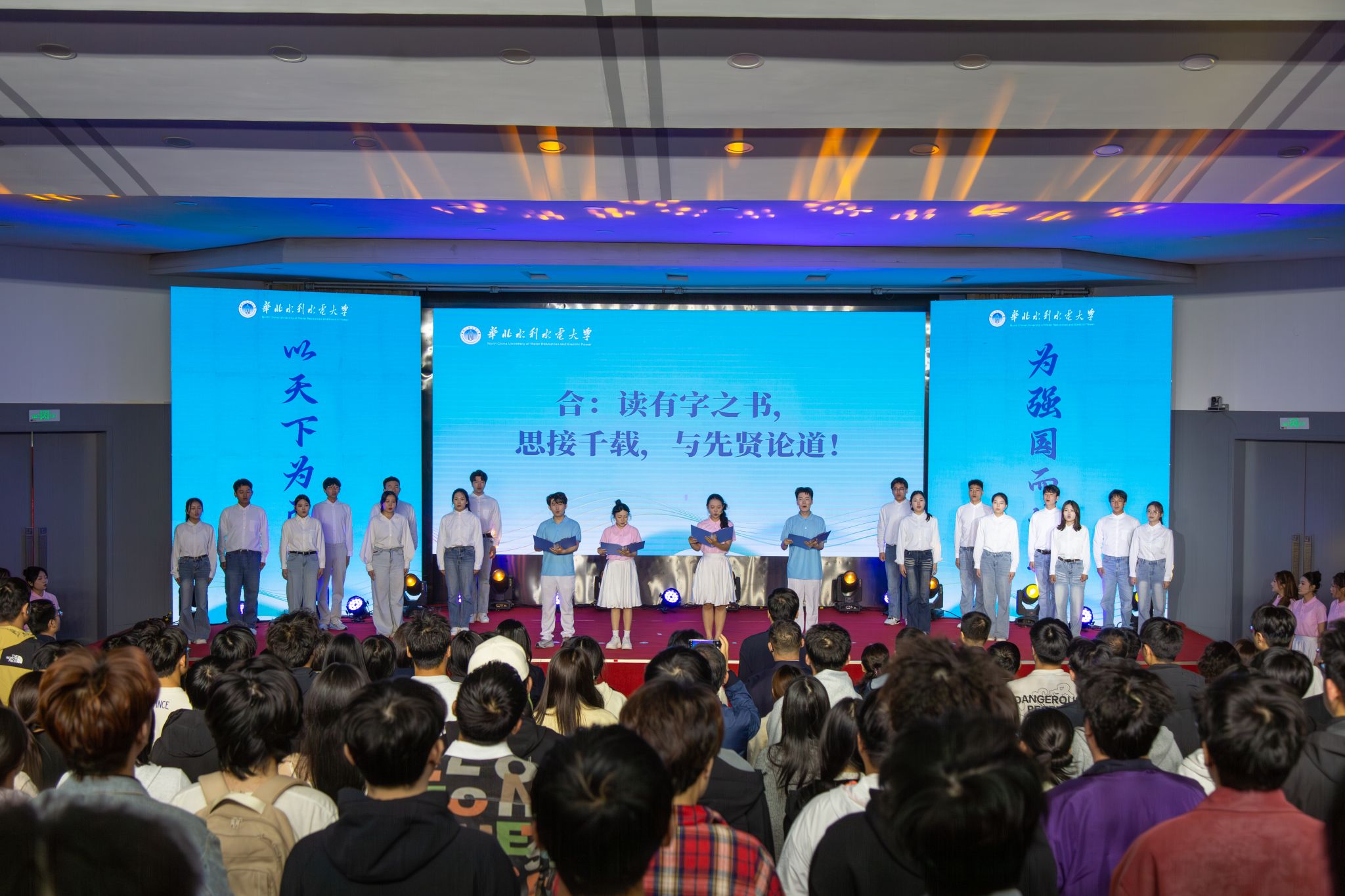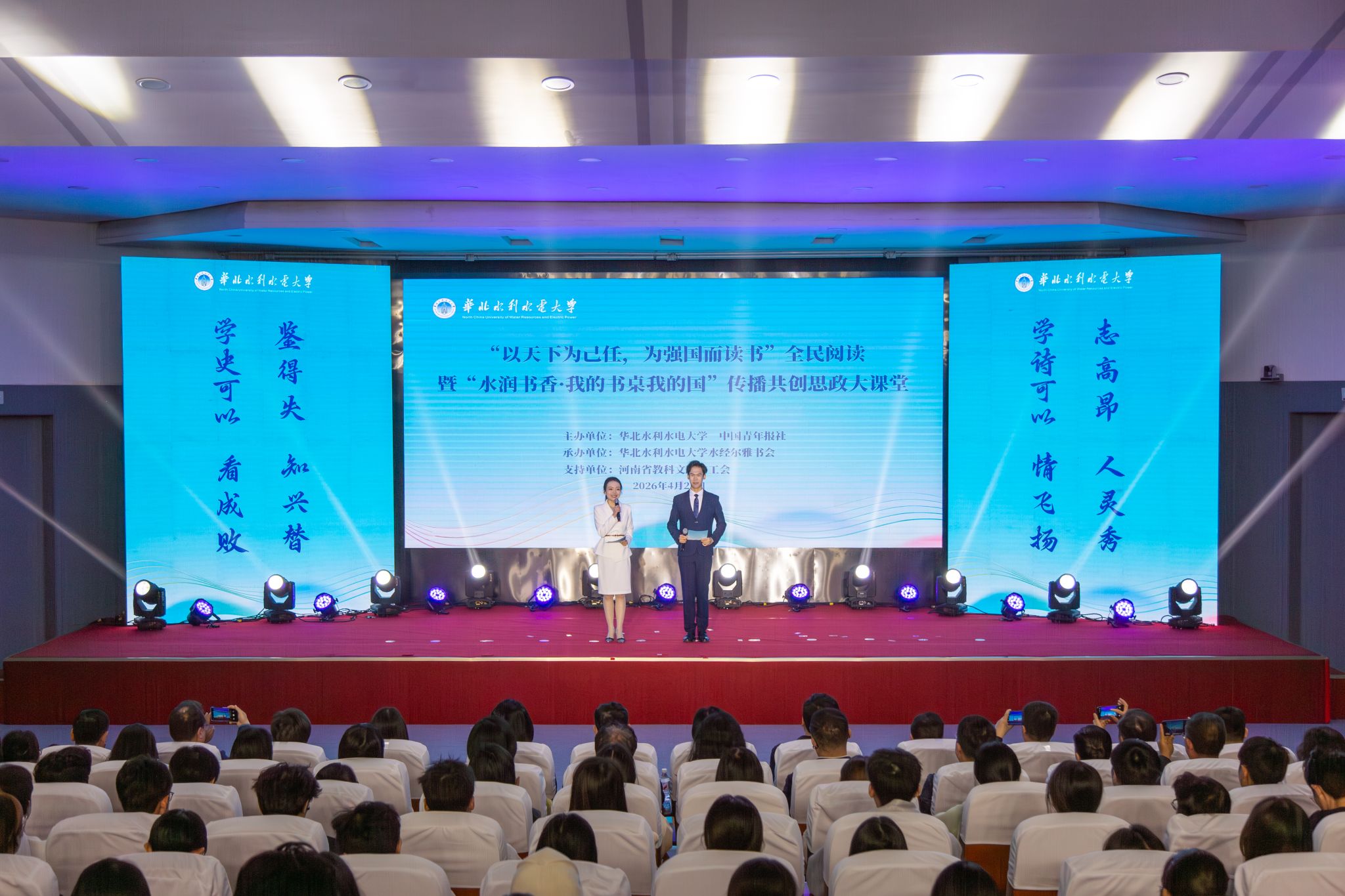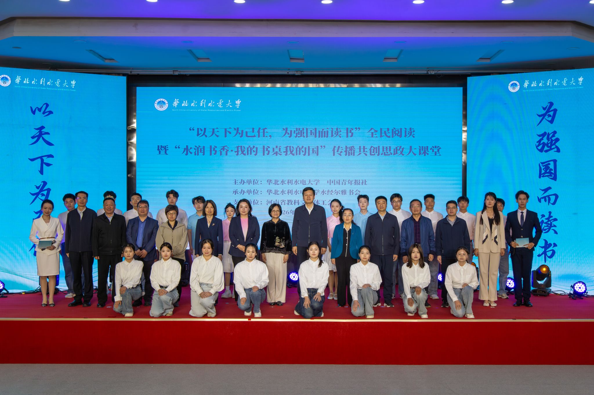 活动现场,董时和王笃波共同启动“以天下为己任,为强国而读书”全民阅读暨“水润书香·我的书桌我的国”传播共创思政大课堂。学生代表现场发布《华水青年“为强国而读书”倡议》,号召广大青年学子爱读书、读好书、善读书,把阅读之志融入强国建设、民族复兴伟业,把青春奋斗写在祖国大地上。