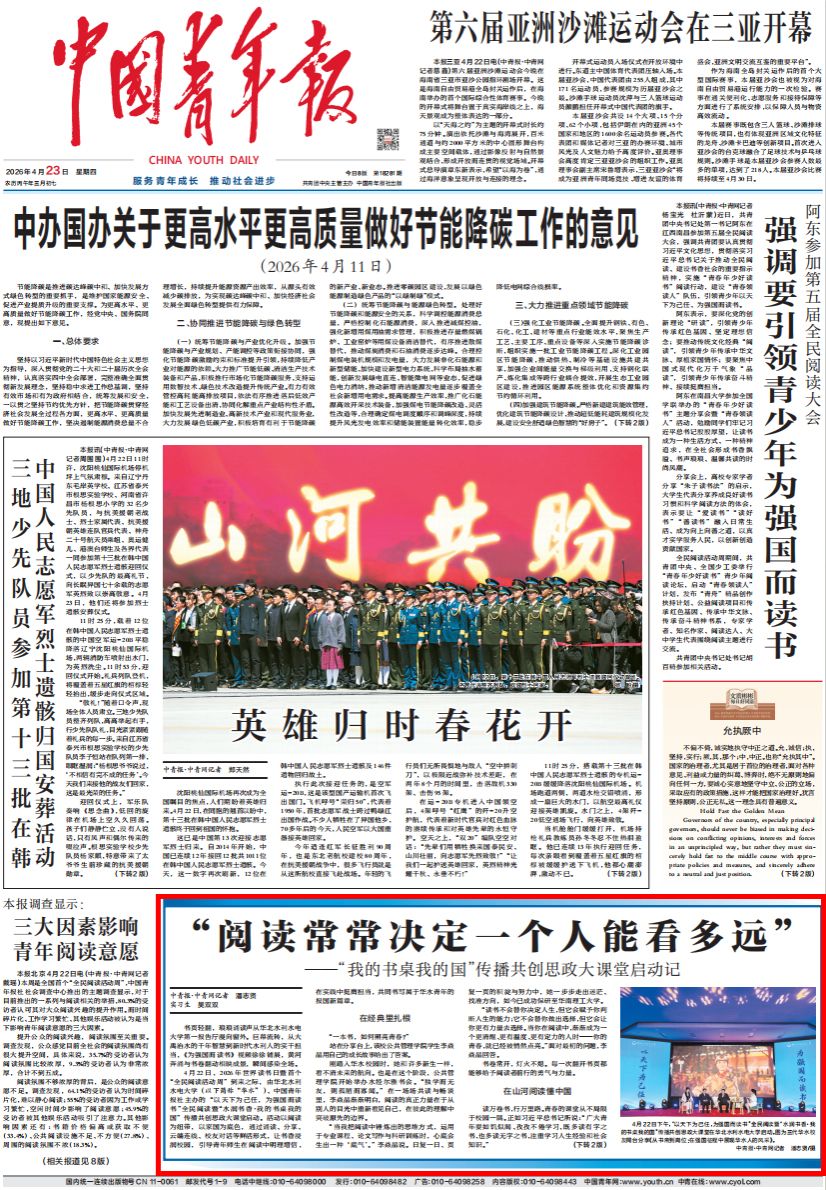 4月22日,2026年世界读书日暨首个“全民阅读活动周”到来之际,由华北水利水电大学(以下简称“华水”)、中国青年报社主办的“以天下为己任,为强国而读书”全民阅读暨“水润书香·我的书桌我的国”传播共创思政大课堂启动。活动以阅读为纽带,以家国为底色,通过诵读、分享、云端连线、校友对话等鲜活形式,让书香浸润校园,引导青年师生在阅读中明理增信,在实践中挺膺担当,共同书写属于华水青年的报国新篇章。